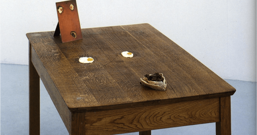 The eggs congeal and the meat putrifies. Rotting-food art is a cliché of the contemporary avant garde. In the early 1980s and early 1990s, Helen Chadwick used fruit and vegetables to allude in a metaphorical or poetic way to all sorts of aspects of the feminine; the shape of genitalia, female fecundity, sexual exchange, and so on. Foodstuff in Chadwick’s art often went with images of her naked body. Food went with a less emotionally distanced and more freaked-out kind of nudity in performances of the 1960s and 1970s in America and Europe. In New York, Carolee Schneemann rolled naked in supermarket chickens and sausages. And in Vienna members of the Aktionismus group, led by Hermann Nitsch and Otto Muehl, slaughtered farm animals in front of audiences, and writhed in the blood, in orgiastic happenings styled after fantasies of pagan rituals. But Two Fried Eggs and a Kebab is different from any of these precedents, because it is not soppy, solemn or frenzied, but dry, witty, clever and sly.