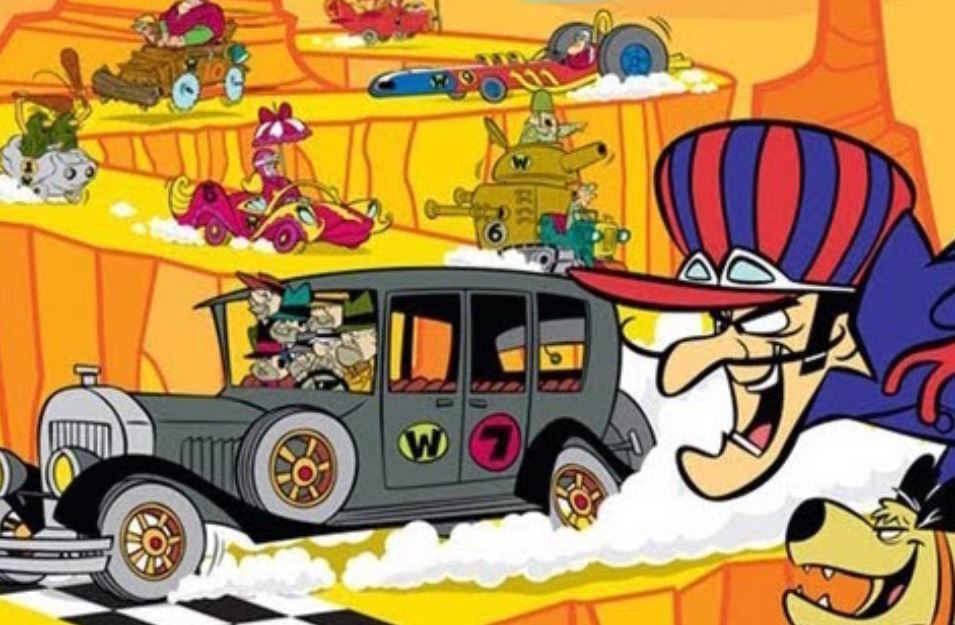 …. and now here they are!!!! The most daredevil group of daffy drivers to ever whirl their wheels in the Wacky Races, competing for the title of the worlds wackiest racer. The cars are approaching the starting line. First, is the Turbo Terrific driven by Peter Perfect. Next is Rufus Ruffcut and Sawtooth in the Buzzwagon. Manoeuvring for position is the Army Surplus Special. Right behind is the Ant Hill Mob in their Bullet Proof Bomb. And there’s ingenious inventor Pat Pending in his Convert-A-Car. Oh! And here’s the lovely Penelope Pitstop, the glamour gal of the gas pedal. Next we have the Bouldermobile with the Slag Brothers, Rock & Gravel. Lurching along is the Creepy Coupe with the Gruesome Twosome, and right on their tail is the Red Max. And there’s the Arkansas Chug-A-Bug with Luke & Blubber Bear. Sneaking along last is that Mean Machine with those double dealing do-badders Dick Dastardly and his sidekick, Muttley.
