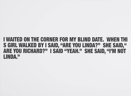 I’d been re-photographing images for ten years. Beginning the jokes was like starting over. I didn’t know what I was doing. At the time sculptors were casting sculptures in bronze, making huge paintings, talking about prices and clothes and cars and spending vast amounts of money. So I wrote jokes on little pieces of paper and sold them for $10 each. I had a hard time selling them. One dealer bought two and asked for a 10% discount. So I decided that every six months I’d double the price. All this was possible because no one was looking at my work. That’s a fairly good position sometimes. You can get away with a lot of things.