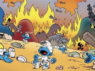 Smurfette is left for dead. Baby Smurf is left crying and orphaned as the Smurfs’ village is carpet bombed by warplanes – an horrific scene and imagery not normally associated with the lovable blue-skinned cartoon characters. They are the scenes being shown as part of a new UNICEF ad-campaign to raise funds for former child soldiers in Africa.