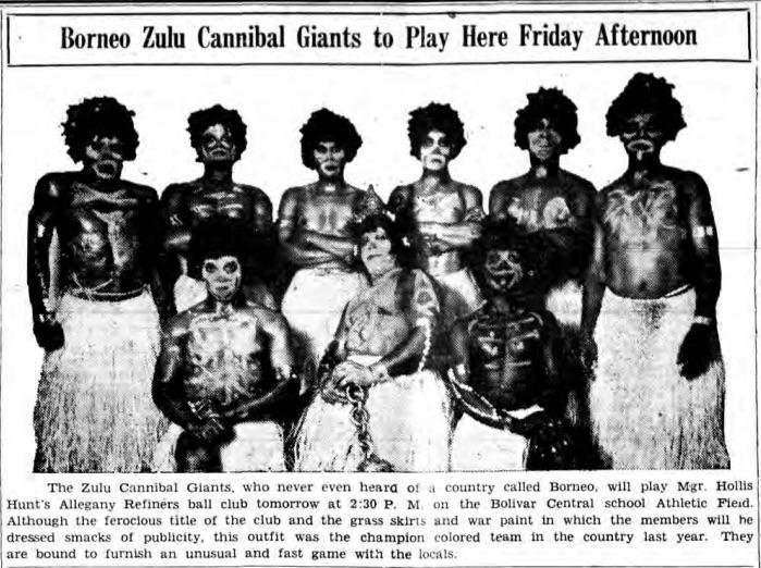 Inspired by the success of white novelty teams, including the Hillbillies, who wore overalls and straw hats, black promoter Charlie Henry organized the Zulu Cannibal Giants in the mid-1930s, featuring players clad in grass skirts, headdresses, and war paint. Pandering to white America’s worst attitude and most stereotypical views of blacks, the players entertained fans between games with various “comedy” acts including staged fights with spears and shields along with a crap game featuring loaded dice and players brandishing razors.
