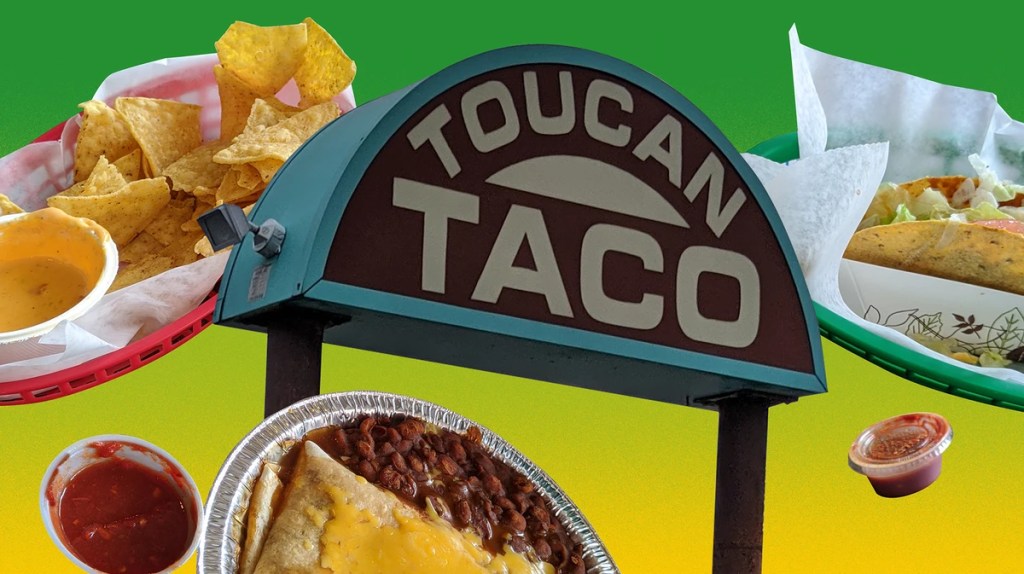 Inside Toucan Taco, the wood-veneer panel on the walls is original. The drop ceiling remains untouched, water stains and all. The tables are nearly fifty years old, but sturdy. Most importantly, the Mexican gravy-smothered burritos and golden queso on the menu are the same as when the establishment was known as Tippy’s Taco House, a Dallas area-born Tex-Mex franchise dating back to the 1950s.