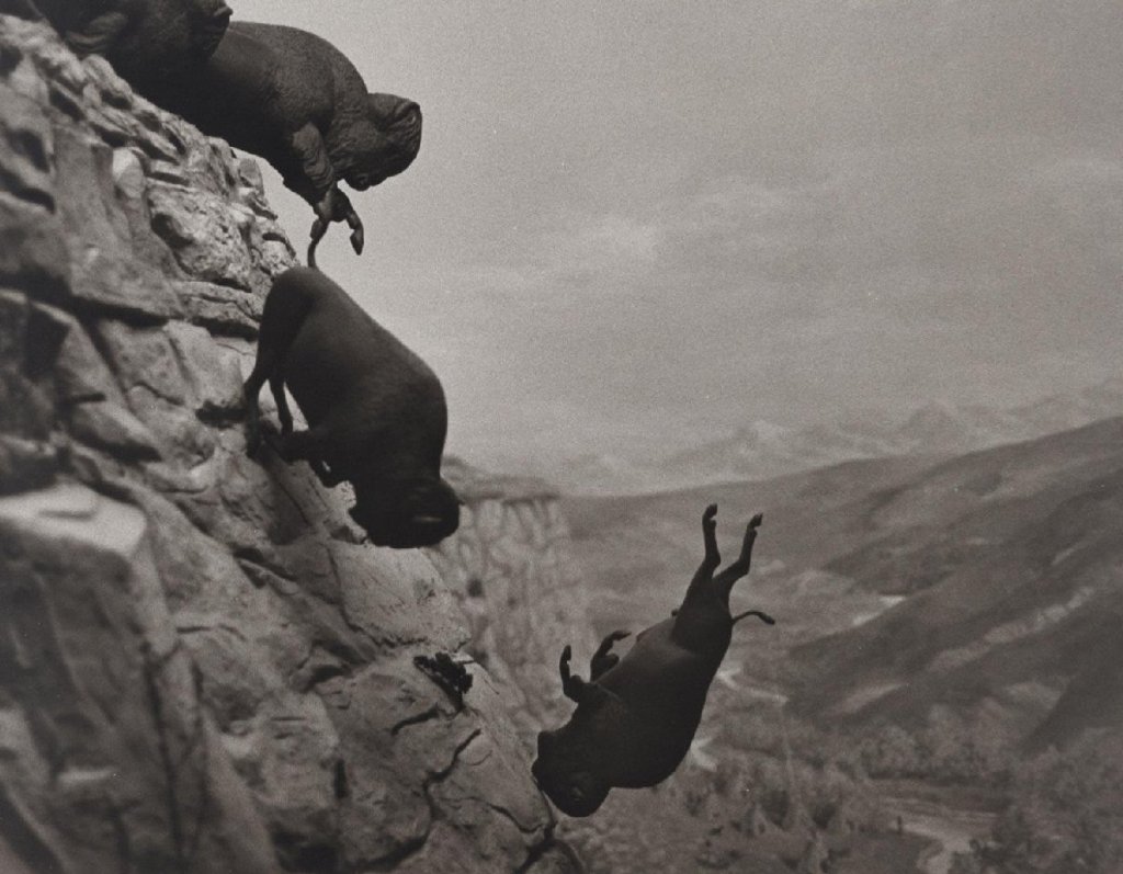 The buffalo is an animal so sacred to Americana that it once graced the tails side of the nickel, and it was going off a Southwestern, Spaghetti Western cliff like a lemming, presumably driven on by hunters who nearly pushed the animal to extinction. The photograph goes far beyond representing the death of the American dream. In a simple image, it captures the forced, borderline-psycho disillusionment felt by anyone left of center during an age in which the Right was right and homosexual men died because God himself had descended from the heavens to exact his revenge. This is not Death of a Salesman. This is the photographic equivalent of Allen Ginsberg’s Howl, an indictment of a sick nation reeling in riches and hubris even as it feasted on the weakest, cast the mentally ill out into the streets, and blamed death on the dying.