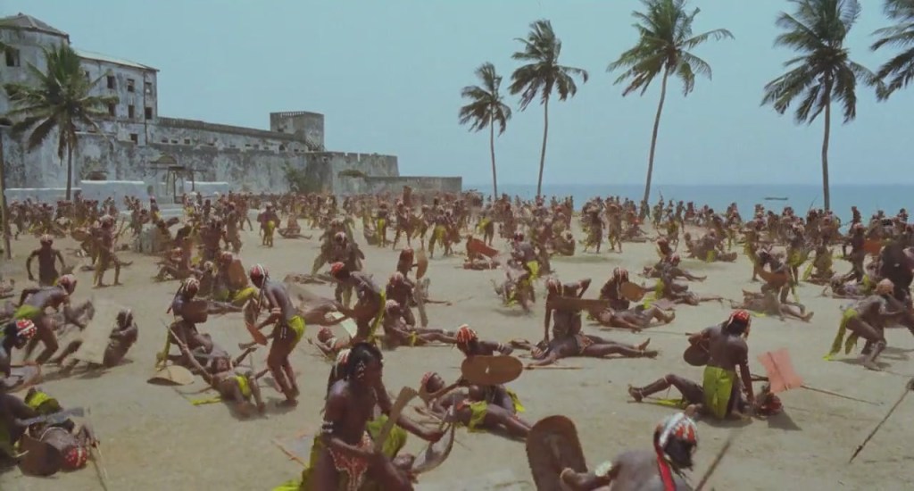 He crossed burning savannahs and swam rivers infested with crocodiles. Before an attack on a village, he would lash leaves to his hat and lie motionless till cockcrow. Then, as the dawn silhouetted the roofs like teeth on a sawblade, a whistle would blow, the air fill with raucous cries and, by the end of the morning, the Amazons would be parading before the King, swinging severed heads like dumb-bells.