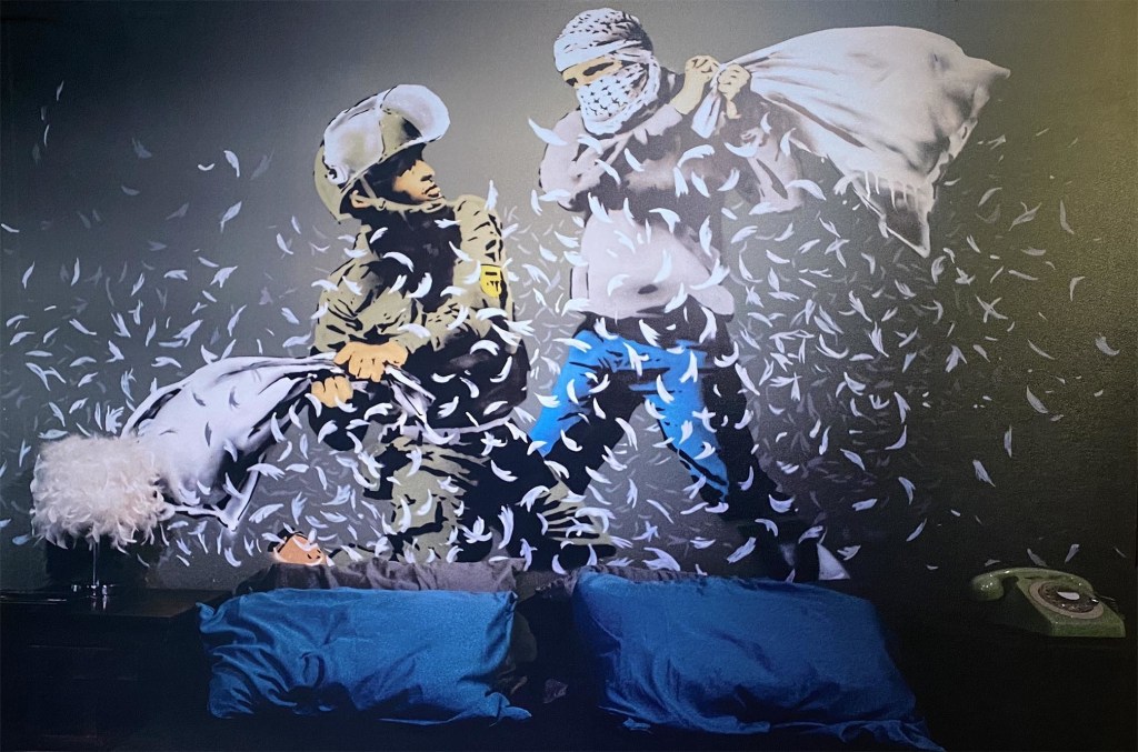 The Walled Off Hotel is only four metres from the wall which cuts through the occupied West Bank and all the rooms face it. “It has the worst view of any hotel in the world,” Banksy said in a statement. Dozens of his new works adorn the walls. Above one bed an Israeli soldier and a Palestinian protester fight with pillows, while a television supposedly showing CNN is cracked and backwards. In the presidential suite, a working jacuzzi is fed from a working water tank similar to those that adorn the roofs of many Palestinian homes.