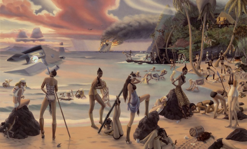 In [Hilary Harkness’s] Flipwreck (2004), all-female tribes battle over a World War II beachhead – there are blonde American sailors, natives clad in coconut shell bras, Aryans with riding crops, and Japanese fly girls wearing goggles. All are slim and leggy, perfect for mortal combat and elaborate bondage rituals.