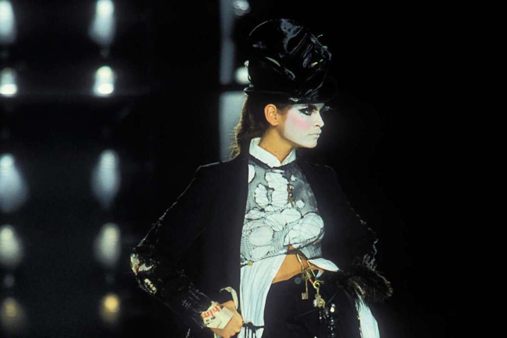 To Madonna’s new cover of “American Pie,” a model walked out dressed out in a pair of overalls made of newsprint fabric. She was followed by others in torn fishermen’s sweaters, shredded skirts marked with cigarette burns, ragged chiffon gowns over more newsprint, and hole-ridden baggy pants. Everything was constructed askew again and accessorized with belts decorated with dangling knickknacks and found objects. “John Galliano has more guts than the local butcher,” declared Women’s Wear, and applauded him for creating “magic” on the runway.