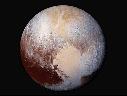 Ice mountains as tall as the Rockies loom high over Pluto’s surface. They are made of water so cold as to be like rock, and they rise out of a surface of frozen methane and nitrogen. About every 150 hours, a brilliant star rises from behind the peaks. The star is no larger than a dot – not really bigger than any pinprick in the sky – but it shines with the brightness of tens of thousands of full moons. Good morning, Pluto.