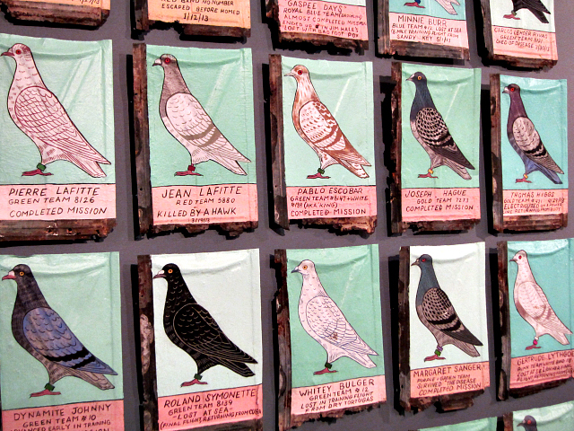 For his Fly By Night show, he sent 2,000 homing pigeons carrying LED lights into the night sky. Previously his work Trading with the Enemy saw Riley fly pigeons from Key West to Havana smuggling Cuban cigars and for Now Those Days Are Gone, Riley embroidered portraits of 1,000 different pigeons complete with unique names and the loft in which they were bred.