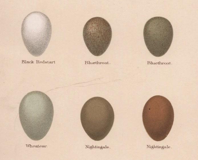 A sheltered and darkened situation is generally chosen by the Wheat-ear wherein to build her nest – chinks of stone walls, the ruins of cairns, in old rabbit-burrows, under stones on moors, mountain wilds, &c. The nest, not very artistic in construction, is composed of a variety of materials, such as bents, grass roots pulled up by the sheep when grazing, and dried in the sun, hair and wool gathered from brambles, corners of rocks, and walls against which the sheep have rubbed themselves. The eggs number five or six, and are of a pale greenish-blue colour unspotted.