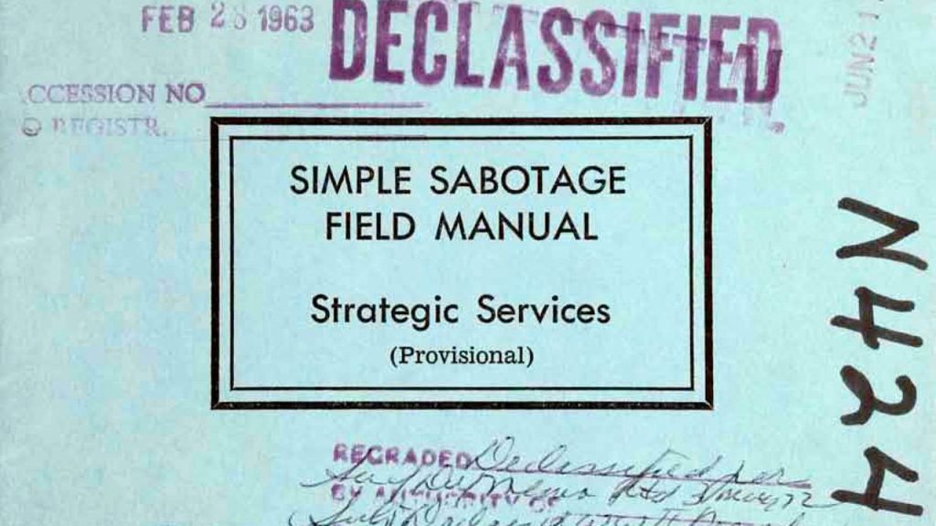 Where destruction is involved, the weapons of the citizen-saboteur are salt, nails, candles, pebbles, thread, or any other materials he might normally be expected to possess as a householder or as a worker in his particular occupation. His arsenal is the kitchen shelf, the trash pile, his own usual kit of tools and supplies. The targets of his sabotage are usually objects to which he has normal and inconspicuous access in everyday life.