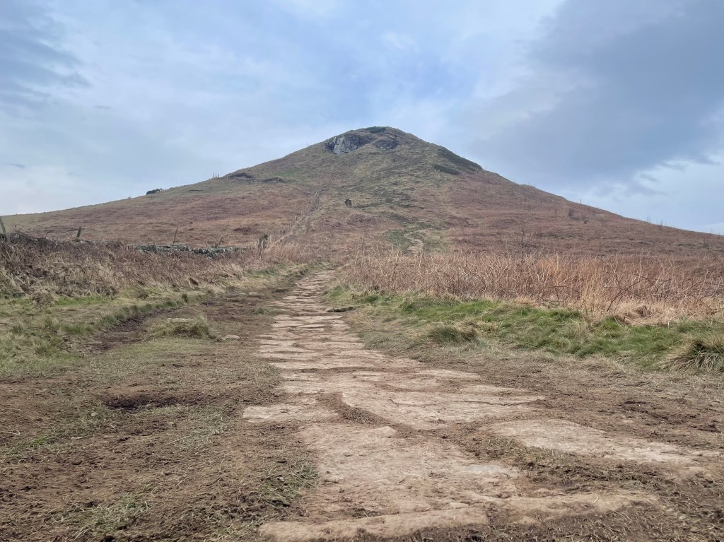 Roseberry Topping stands out in grim isolation, on its masses of alum rock, like a huge seaworn crag, considerably over 1,000 feet high. But this strangely menacing peak raises its defiant head over nothing but broad meadows, arable land, and woodlands, and its only warfare is with the lower strata of storm-clouds.