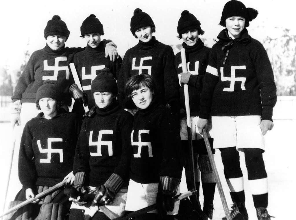 The Fernie Swastikas were a women’s ice hockey team formed in British Columbia in 1922. Their uniform comprised white knickers and red sweaters, and used as their logo the swastika, which before World War II was a common religious symbol, said to represent luck and success. There were other teams named after swastikas in Edmonton and Windsor. The Swastikas won the Alpine Cup at the Banff Winter Carnival in 1923.