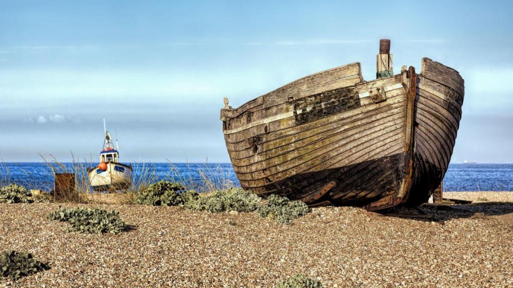 Dungeness is a premonition of the far North, a landscape Southerners might think drear and monotonous, which sings like the birch woods in Sibelius’ music. From my home I can see the sun clamber out of a misty sea. It wakes me through the bedroom window and then stays with me all day. There are no trees or hills to hide it. When it sets over the flatlands in the west I sit and watch it on a throne-like chair I rescued from a rubbish dump. I never miss the setting sun, however cold the weather.