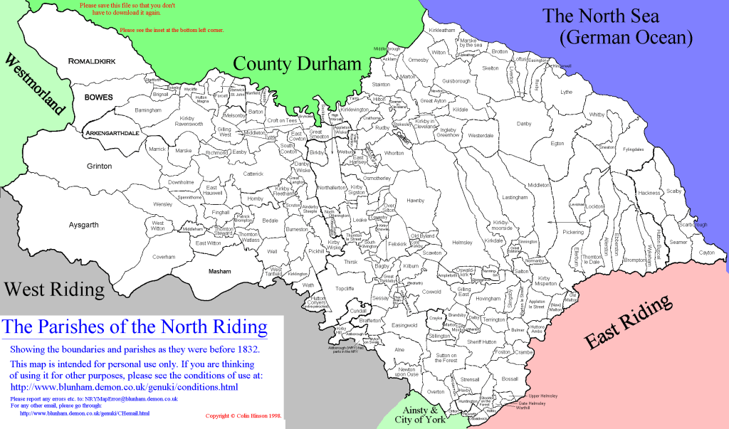 The North Riding comprised individual parishes, which evolved into more numerous civil parishes in the mid 19th century. This accounts for many of the anomalies in its border. See more via Genuki here.